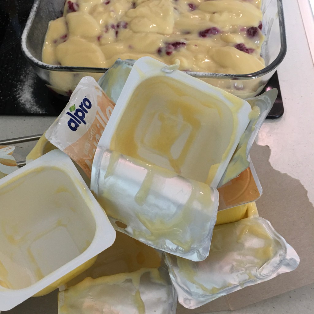 -Alpro vaniljedessert (finnes i “fri for”-hylla i butikken) Bruk alle 4 pakkene. - Smuldre så smuldredeigen over det hele. Og om du vil er det ekstra godt, synes jeg, å strø over