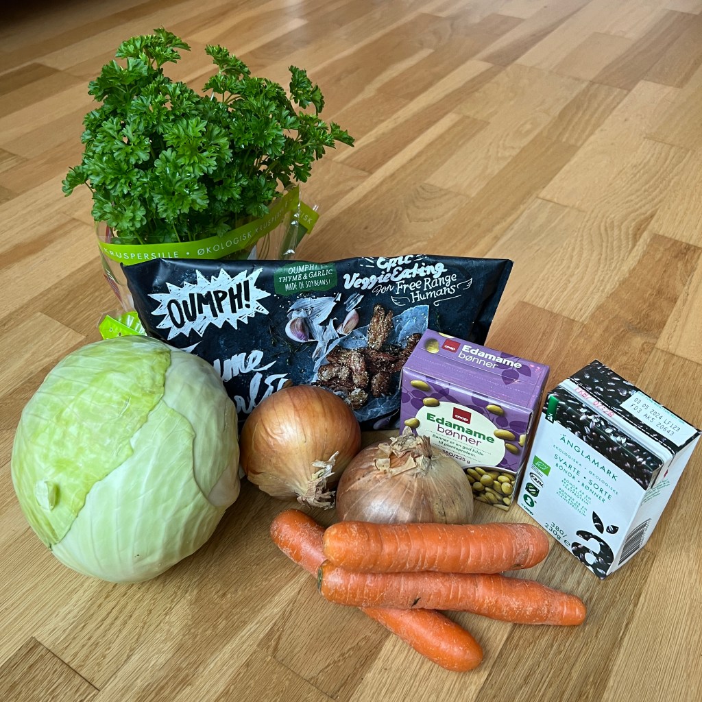 Til denne retten er Oumph Chunk, Garlic and Thyme fantastisk god. Og jeg digger Grønn Matportals Vegikål med masse kjøtterstatning. Jeg anbefaler alle å prøve oppskriften med tre poser Oumph. Jeg foretrekker også tipset deres med å ha i gulrøtter.